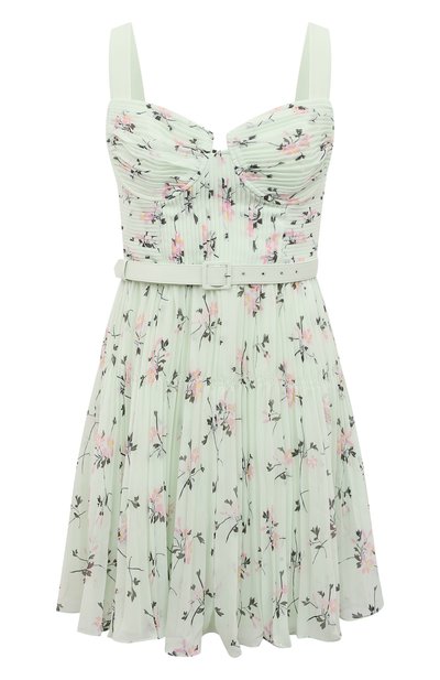 Тонкий шифон с цветочным узором сделал салатовое мини-платье почти невесомым. На нежной ткани заложили мелкую плиссировку, которая меняет направление так, чтобы деликатно подчеркивать облегающий лиф и чашечки на косточках. Складок нет только на широких однотонных бретелях и ремне. Модель с легким подкладом застегивается потайной молнией сзади.