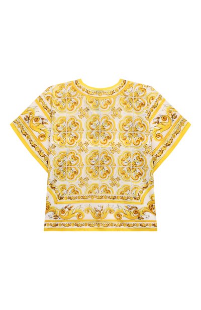 Свободную тунику сшили из гладкого хлопкового поплина с ярким принтом, повторяющим узоры майолики Кальтаджироне. Мастера марки искусно раскроили модель из ткани с уже нанесенным на него мотивом так, чтобы рисунок располагался строго симметрично. Основание V-образного выреза украсили небольшим бантом, а края вещи подчеркнули бахромой из миниатюрных помпонов.