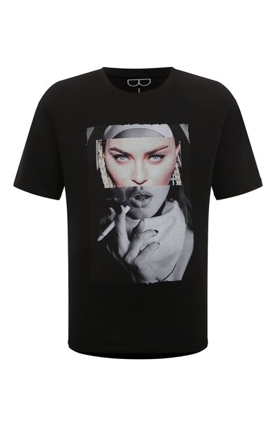Мастера марки использовали для пошива черной футболки с короткими рукавами мягкое хлопковое джерси. Дышащий материал слегка тянется, сохраняя свободу движений, но не теряет форму со временем. В фокус внимания модель выводит фотоколлаж, центральную роль в котором отдали цветному снимку Мадонны.