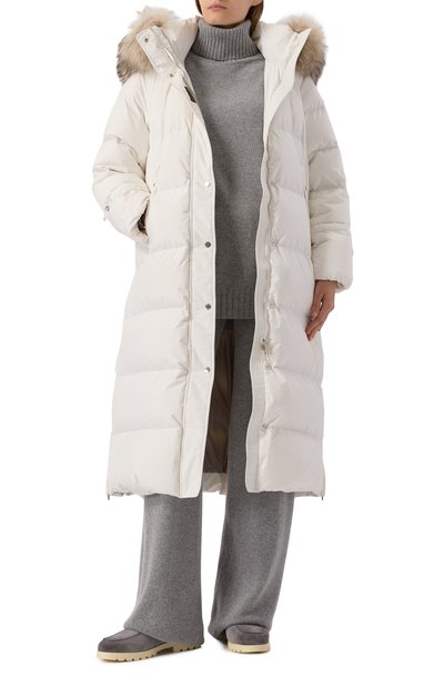 Белую куртку сшили из гладкого шелковистого полиэстера, защищающего от дождя и ветра. Стеганые камеры модели равномерно заполнили почти невесомым гусиным пухом, обеспечивающим комфортную температуру. Для дополнительного тепла и защиты от холода предусмотрели глубокий капюшон с отделкой пушистым мехом енота и планку, закрывающую молнию.