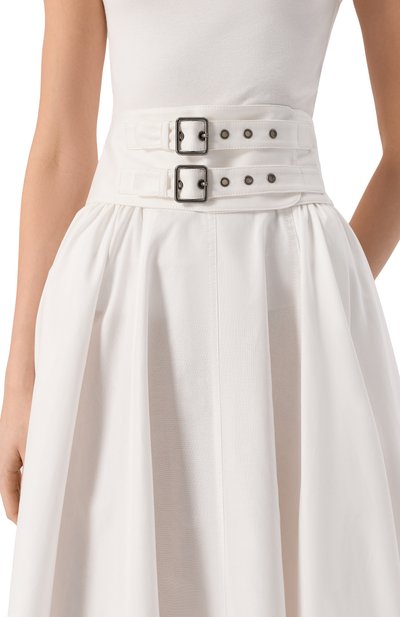 Ремень со шлевкой мастера бренда изготовили из мягкой, но прочной кожи чистого белого цвета. В тон материалу подобрали эмаль, которой подчеркнули объемную эмблему The Big D на крупной овальной пряжке из отполированного металла оттенка серебра.