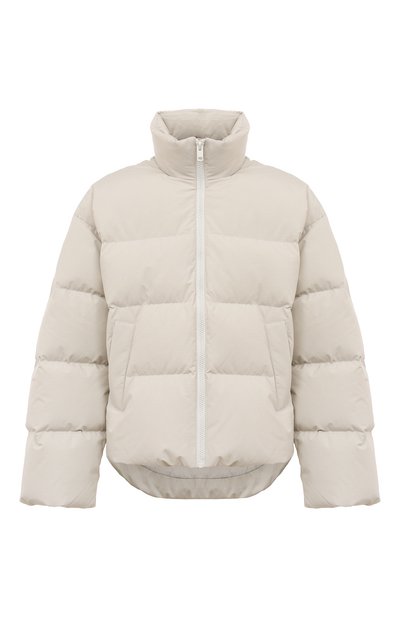 Для изготовления кремового укороченного пуховика силуэта оверсайз мастера марки использовали плотный матовый текстиль, отталкивающий капли влаги. Прочный материал хорошо защищает от ветра, легко очищается от загрязнений и быстро сохнет. Чтобы наполнитель из утиного пуха не свалялся после чисток, куртку с объемной тисненой эмблемой сзади прошили горизонтальными строчками.