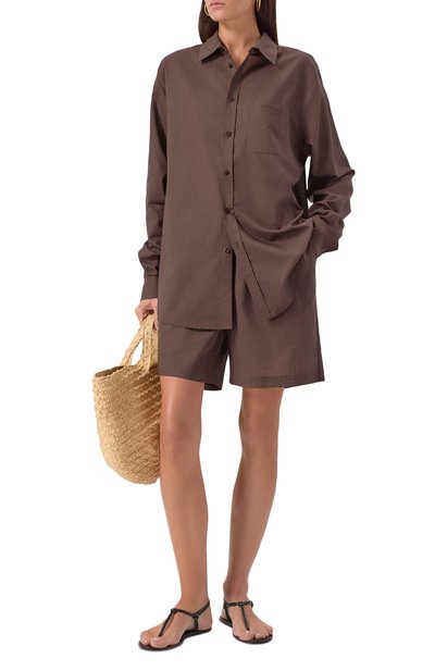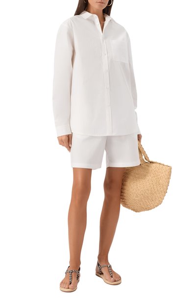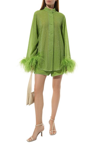 Сиреневую блузу со свободными рукавами, дополненными широкими манжетами, выполнили из полупрозрачного материала на основе нейлона. В состав добавили металлизированные волокна, поэтому изделие мерцает под лучами света. Наши стилисты рекомендуют рифмовать модель с шортами в тон, завершив наряд черными босоножками и клатчем.
