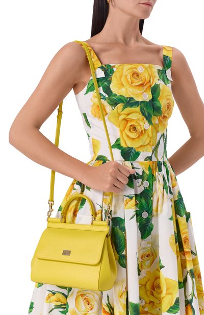 Для создания миниатюрной версии знаковой для марки сумки Sicily Доменико Дольче и Стефано Габбана выбрали плотную кожу оттенка сочной травы. Материал с выразительным тиснением Dauphine не боится царапин и заломов. На ярком фоне ослепительно светится фурнитура с гальваническим покрытием: двухцветная пластина на широком клапане, кольца для крепления короткой ручки и съемного плечевого ремня, пряжки и карабины. В аксессуаре с плоским внутренним карманом хватит места для картхолдера, ключей и помады.