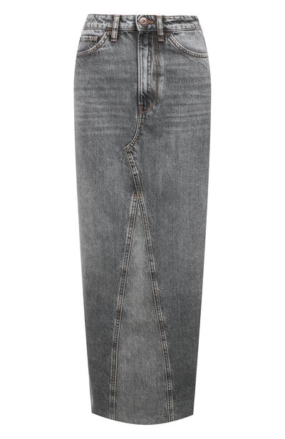 Серая юбка выглядит так, будто ее перешили из джинсов. Такой эффект создают характерные швы спереди, фигурная вставка на тон светлее и обрезанный вручную необработанный край изделия. Для изготовления модели использовали выбеленную хлопковую ткань.
