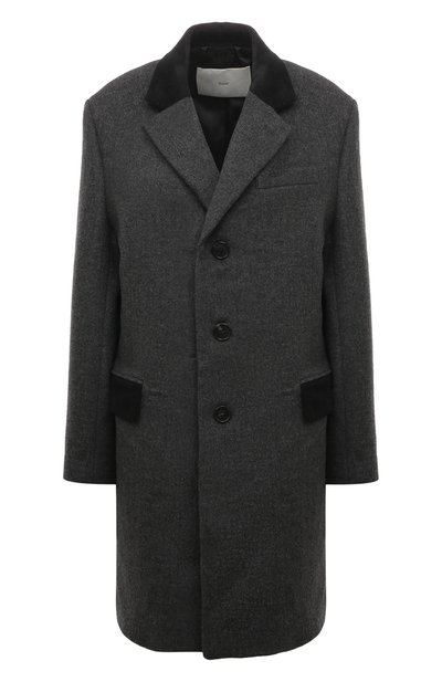 Прямой крой с чуть смягченной линией плеч и сдержанный темно-серый оттенок вывели это однобортное пальто за рамки переменчивых модных течений. Сохранять актуальность из сезона в сезон модели поможет и плотная полушерсть с едва заметной фактурой. Дизайнеры марки подчеркнули лаконичность изделия деликатным контрастом, который создал черный бархат на клапанах карманов и воротнике.