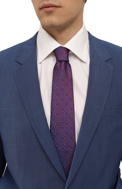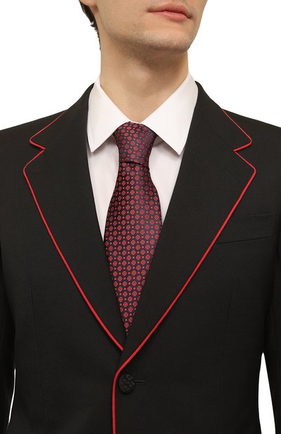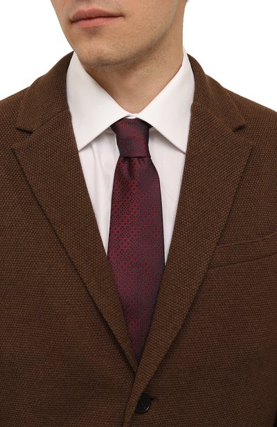 Для создания бордового галстука с графичным узором Garden использовали мягкий шелковый жаккард. Заготовку, раскроенную по диагонали, заложили в складки от краев к центру и соединили эластичным ручным швом. Такой аксессуар хорошо ложится в узел любой сложности, не деформируется и расправляется, не оставляя заломов.
