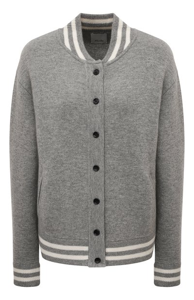 Серый меланжевый кардиган выполнили из тонкой шерстяной пряжи с включением нежного кашемира. Модель из такого материала отлично сохраняет тепло, поэтому сможет заменить легкую куртку в прохладную погоду. Полосатый белый мотив на поясе, манжетах и воротнике-стойке, как у бомбера, добавляет изделию спортивное звучание и выводит его за рамки офисного гардероба.
