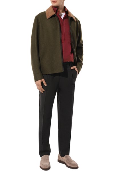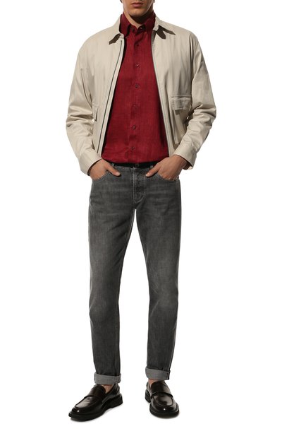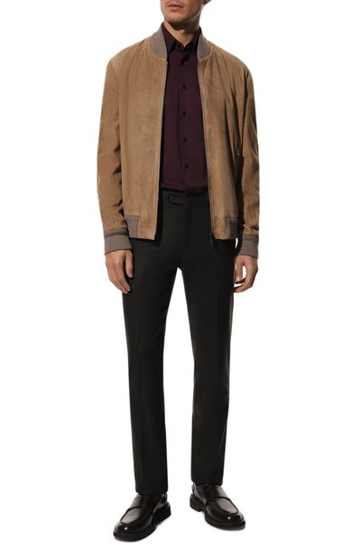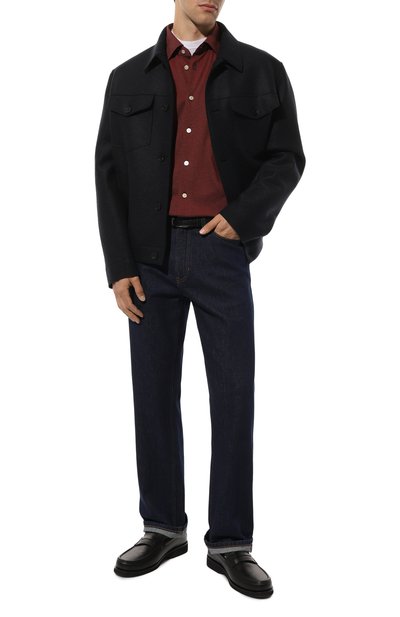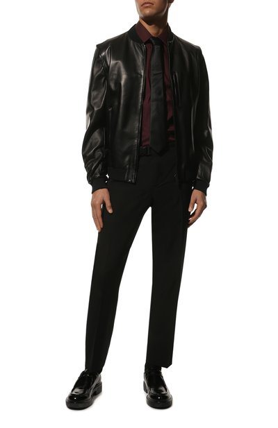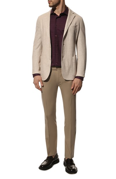 Для изготовления рубашки с шевронным микроузором и меланжевым эффектом использовали хлопок. Модель со скошенными манжетам и фигурным низом застегивается брендированными пуговицами. Воротник украсили серебристой эмблемой марки сзади.