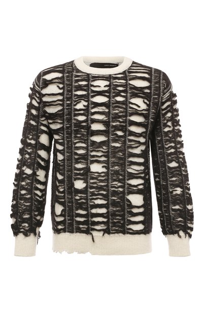 Изабель Бененато вывела белый свитер в центр внимания черной неравномерной отделкой, которой модель продублировали полностью. Сходство с одеждой в стиле гранж усилили разрывами по краю пояса. Для создания использовали мягкую, приятную на ощупь пряжу из шерсти и пушистого мохера, а чтобы изделие не пилинговалось, в состав добавили нейлон.