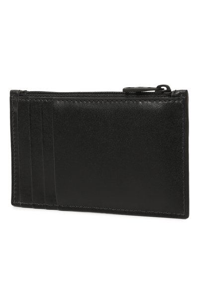 Черный небольшой картхолдер украсили контрастным логотипом марки в стиле граффити. Для пошива модели использовали тщательно выделанную вручную мелкозернистую кожу, устойчивую к потертостям и царапинам. Для кредитных карт в аксессуаре предусмотрели четыре слота, разделенных отделением для купюр и чеков.