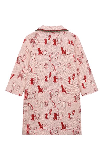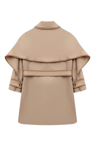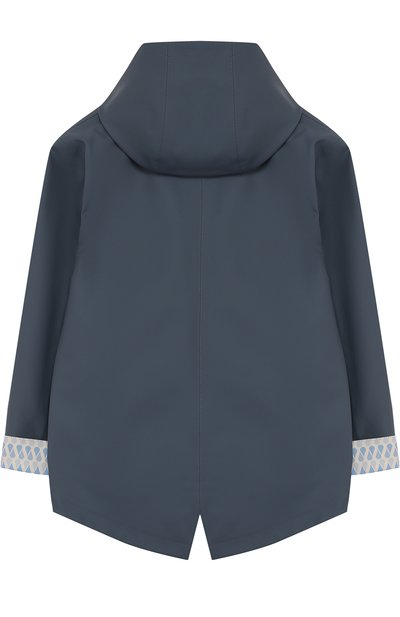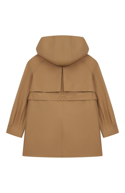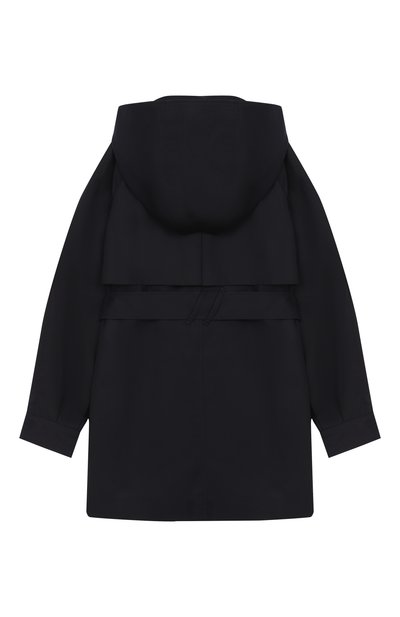 Темно-синий двубортный тренч с отложным воротником и широкими лацканами почти полностью копирует взрослую модель. Для пошива плаща с расклешенной отлетной кокеткой мастера марки использовали мягкий хлопковый твил, защищающий от ветра и влаги. Изделие с патами на манжетах и черным узким кантом, подчеркивающим края деталей, дополнили длинным поясом.