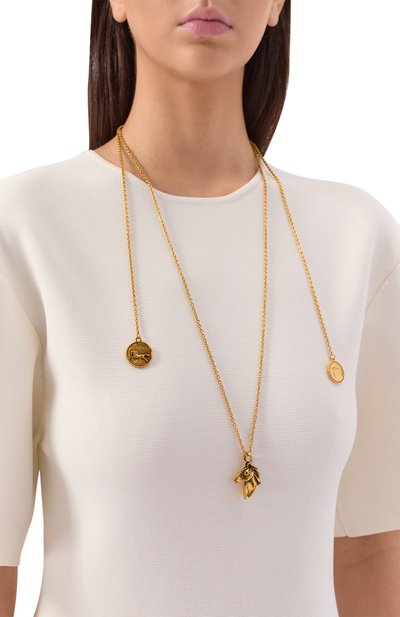 Для создания колье выбрали пиритовые бусины со множеством отполированных четких граней, отражающих свет. Эти фактурные элементы нанизали не на привычную леску, а на тонкий гибкий каркас, поэтому аксессуар отлично держит форму. Незамкнутая конструкция позволяет легко надевать и снимать украшение, обходясь без застежки.