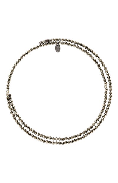 Для создания колье выбрали пиритовые бусины со множеством отполированных четких граней, отражающих свет. Эти фактурные элементы нанизали не на привычную леску, а на тонкий гибкий каркас, поэтому аксессуар отлично держит форму. Незамкнутая конструкция позволяет легко надевать и снимать у крашение, обходясь без застежки.