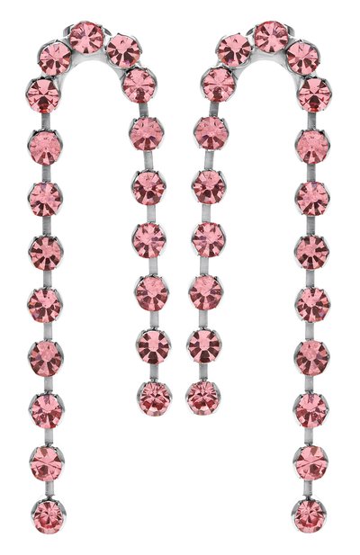 Длинные серьги изготовили из отполированного ювелирного сплава с гальваническим покрытием серебром. Асимметричные подвески инкрустировали вставками из нежно-розовых кристаллов, напоминающих капли. Они ловят и многократно множат каждый луч света, делая украшение эффектным решением и для дня, и для ночи.