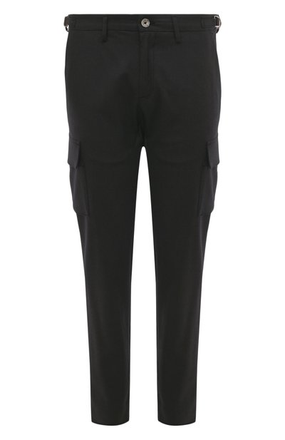 Прямые темно-серые карго – комфортный вариант для городских прогулок. Для пошива модели использовали тонкую ткань из мягкой шерсти с длинными волокнами. Изделие из такого материала поддерживает оптимальную температуру и почти не мнется, долго сохраняя безупречный вид. Марко Пескароло дополнил брюки боковыми ремешками на поясе, регулирующими посадку на талии. В комплекте – съемный брелок с маской Пульчинеллы.