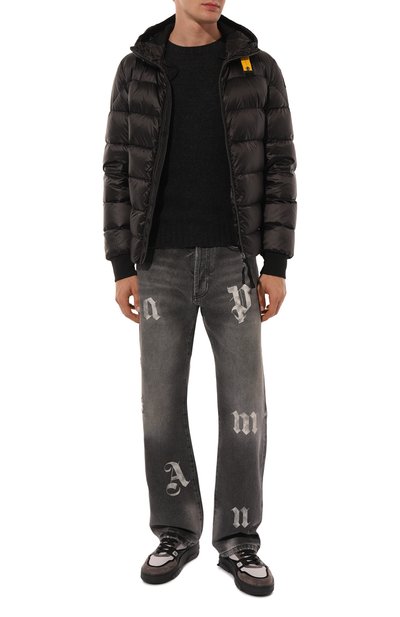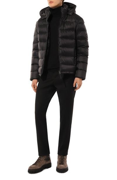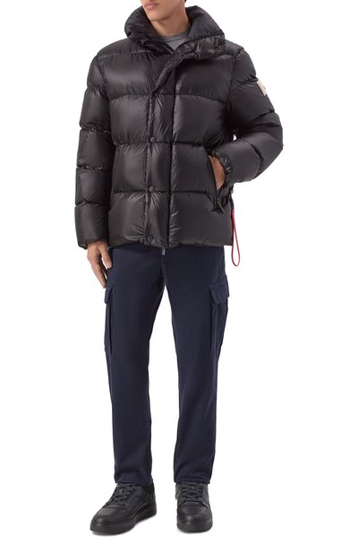 Стеганый пуховик с регулируемым капюшоном сшит из глянцевого нейлона. Модель с эластичными манжетами дополнена внутри съемными ремнями, с помощью которых ее можно носить как рюкзак. Модель и два врезных кармана застегиваются молниями.