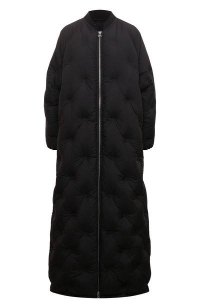 Длинный черный пуховик силуэта oversize мастера марки выполнили из тонкого прочного полиамида, который не продувается ветром. Модель со стеганым узором, напоминающим каретную стяжку, утеплили слоем легкого утиного пуха с добавлением пера, которые поддерживают комфортный микроклимат. Левый рукав пальто, застегивающегося встречной молнией, дополнили съемным брендированным патчем.