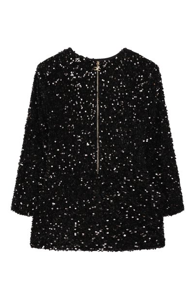 Мастера марки сшили черное платье с расклешенным многоярусным подолом из блестящей бархатистой ткани. Чтобы сделать модель еще наряднее, лиф и манжеты отделали кипенно-белым ажурным кружевом, а спереди овальной перламутровой брошью закрепили атласный бант. Изделие с воротником-стойкой застегивается длинной молнией сзади.