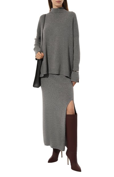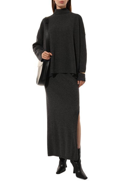 Юбку с высоким боковыми разрезом связали из тонкой пряжи на основе шерсти, вискозы, полиамида и кашемира. Эластичный пояс и отделку низа выполнили в рубчик.