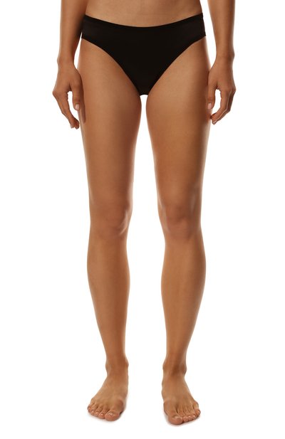Для создания черных слипов дизайнеры марки выбрали тончайший полупрозрачный тюль. Нежный сетчатый материал отлично тянется и не мешает воздуху циркулировать. По бокам белье украсили фигурными деталями из ювелирного сплава, покрытого 24-каратным золотом.