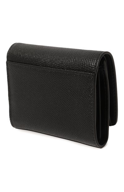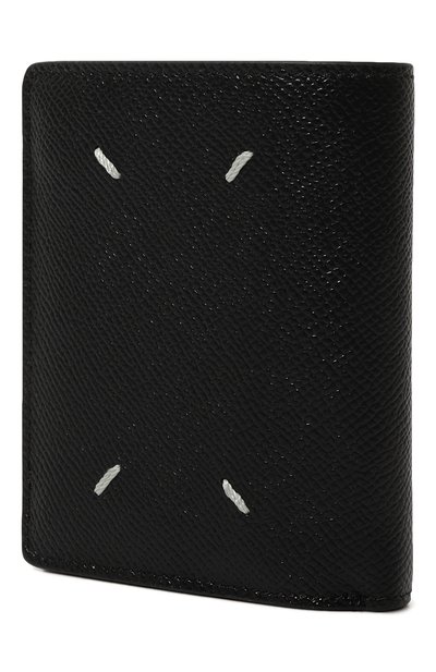 Для пошива черного складного портмоне мастера марки использовали плотную зернистую кожу, которая не требует особого ухода. Спереди модель украсили контрастными белыми стежками, знаковыми для бренда. Аксессуар с отделением для банкнот дополнили внутри двумя боковыми отсеками, а снаружи — монетным карманом.