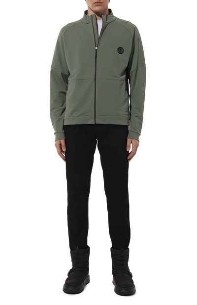Толстовку с высоким воротом сшили из эластичного хлопкового трикотажа. С полосами на рифленых поясе и манжетах зарифмовали вышитый октагон с монограммой SR в центре. Модель с бо ковыми карманами застегивается встречной молнией.