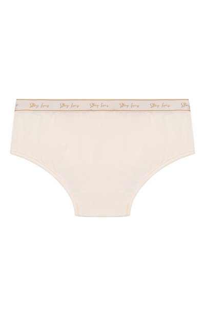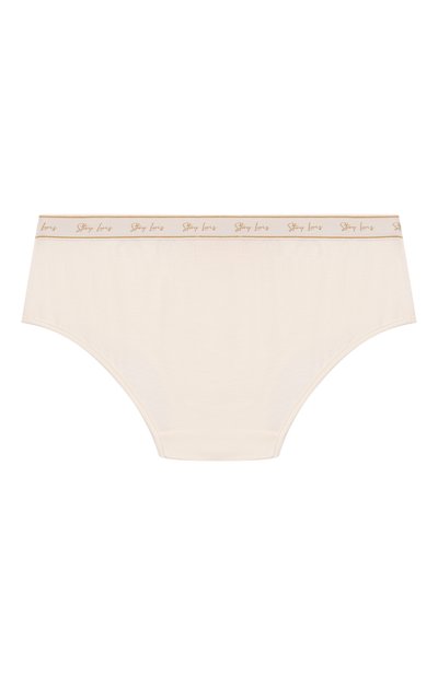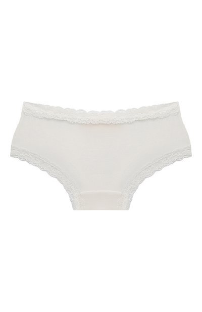 Для пошива кремовых трусов-шортов мастера марки использовали тонкий дышащий трикотаж на основе шелковистого модала. В состав включили эластан, поэтому материал немного тянется. Спере ди модель украсили золотистым логотипом бренда, а края обрамили кружевными оборками.