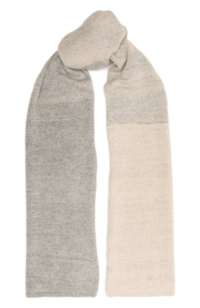 Бежево-серый градиентный шарф мастера марки связали из тонкой пряжи, в которой нежную шерсть соединили с тончайшим кашемиром. Аксессуар из такого материала почти ничего не весит и при этом окутывает теплом, как облаком. Еще эффектнее модель делают нити золотистого люрекса в составе, выразительно мерцающие в лучах света. Длины изделия хватит, чтобы несколько раз обернуть его вокруг шеи.