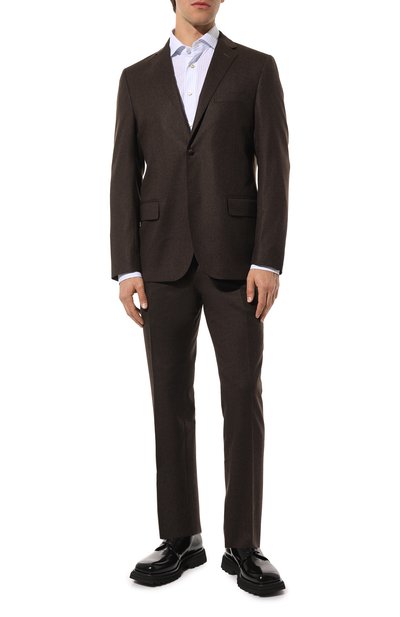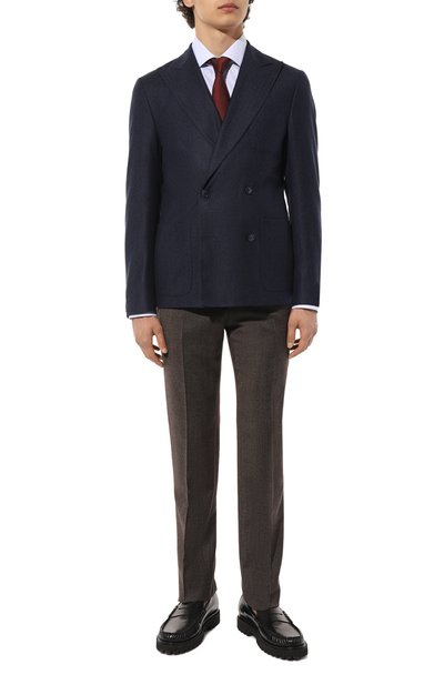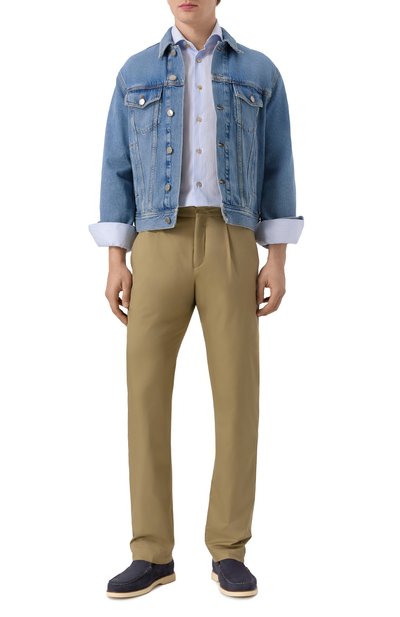Голубую лаконичную сорочку мастера марки сшили из тонкой ткани. Для ее изготовления использовали ультрадлинные шелковистые волокна хлопка премиального качества, поэтому материал хорошо пропускает воздух и практически не ощущается на теле. Воротник «акула» подружится с широким галстуком.
