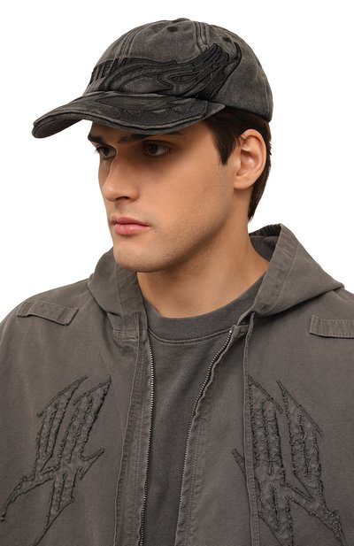 Бейсболку цвета хаки выполнили из шелковистого плотного материала с жаккардовым барочным узором. Знаковый мотив поддерживает логотип бренда, который вышили нитями в тон аксессуару. Посадку можно регулировать ремешком сзади.