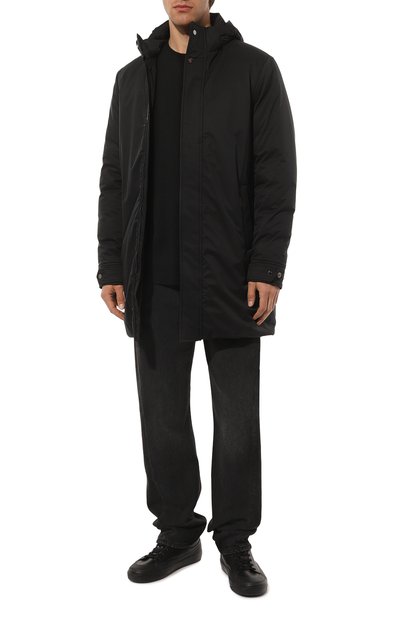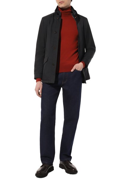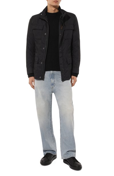 Тонкий утеплитель с добавлением графена адаптирует темно-синюю куртку в стиле сафари для межсезонья. Технологичный материал создает оптимальный микроклимат, а полиэстер снаружи надежно защищает от ветра и дождя. Для максимального комфорта встречную молнию скрыли под штормовой планкой с роговыми пуговицами, а воротник дополнили ремешком, который позволяет поднять и зафиксировать его, и потайным капюшоном.