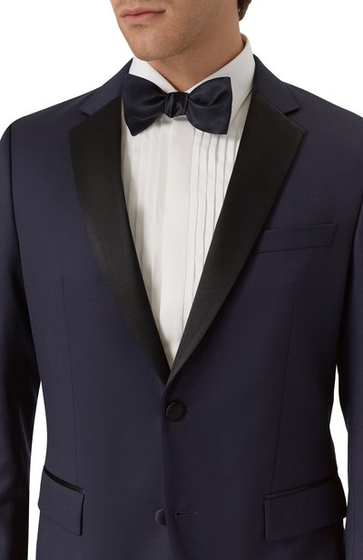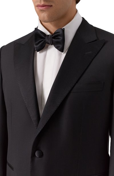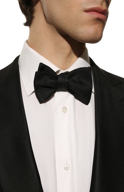 Для изготовления черного галстука-бабочки мастера бренда использовали шелковую ткань с деликатным блеском. Текстиль заложили мягкими складками, а основу продублировали еще одним слоем, чтобы традиционная форма Butterfly выглядела объемнее. Для идеальной посадки аксессуара Pre-Tied ремешок дополнили слайдером.