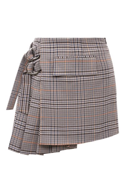 Коричневой мини-юбке в клетку «принц Уэльский» дизайнеры марки задали асимметрию, соединив часть в крупную складку с гладким отрезом. Для пошива модели с двумя широкими ремешками, фиксирующимися пряжками, использовали мягкий плотный материал с добавлением вискозы и эластана. Предлагаем сочетать изделие с кремовым свитером и черными сапогами.
