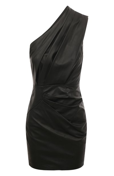 Для пошива черного мини-платья дизайнеры марки выбрали мягкую кожу наппа тонкой выделки. Бережно обработанный материал приобрел такую же пластичность, как нежная ткань, поэтому изделие смогли украсить небольшими драпировками, подчеркивающими асимметричный крой. Модель, открывающую правое плечо, предлагаем сочетать с босоножками и клатчем в тон.
