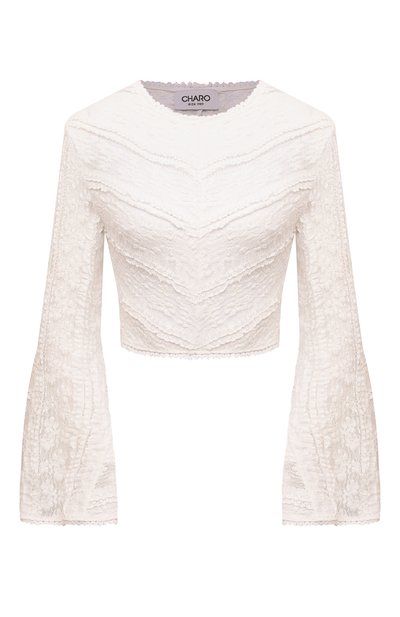 Белый укороченный топ с круглой горловиной выглядит предельно романтично. Модель с фестончатыми краями и расклешенными длинными рукавами выполнили из мягкого органического хлопка, которому придали рельефную эластичную фактуру волокна прочного полиэстера. Из такого же материала изготовили кружевные широкие вставки с нежным цветочным мотивом.