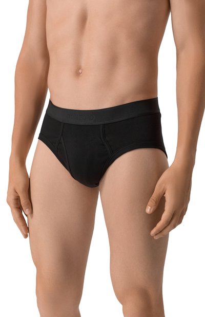 Черные брифы получились особенно приятными на ощупь за счет эластичного нежного трикотажа, соединившего отборный хлопок и тонкий модал. Трусы с плоскими швами легко тянутся во все стороны и позволяют коже дышать. Принадлежность марке подчеркнули контрастным жаккардовым логотипом на широком поясе в рубчик.