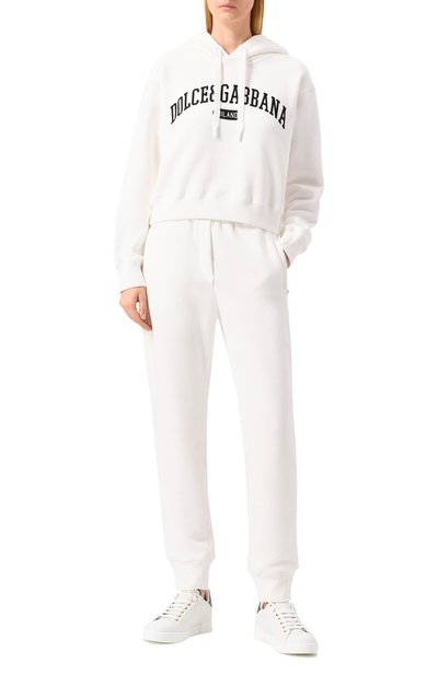 Для пошива короткого белого худи со спущенной линией плеч Доменико Дольче и Стефано Габбана выбрали мягкий хлопковый трикотаж с добавлением полиэстера. Плотный материал с фактурной изнанкой сохраняет тепло. Изделие украсили спереди розовым принтом с изображением монограммы DG, в контуры которой вписали узор в виде майолики. Модель представлена эксклюзивно в ЦУМе.