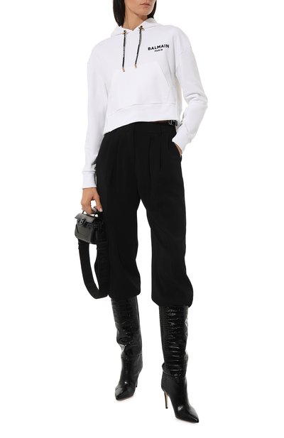 Для пошива короткого белого худи со спущенной линией плеч Доменико Дольче и Стефано Габбана выбрали мягкий хлопковый трикотаж с добавлением полиэстера. Плотный материал с фактурной изнанкой сохраняет тепло. Изделие украсили спереди розовым принтом с изображением монограммы DG, в контуры которой вписали узор в виде майолики. М одель представлена эксклюзивно в ЦУМе.