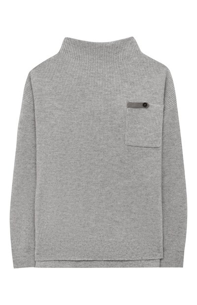 Серый свитер с воротником-стойкой и длинными рукавами связан из премиальной кашемировой пряжи. Ее мягкие шелковистые волокна не раздражают кожу, а изделие из такого материала обеспечивает оптимальную терморегуляцию и почти не ощущается на теле. Нагрудный карман украшен ремешком из знаковых для марки цепочек мониль.