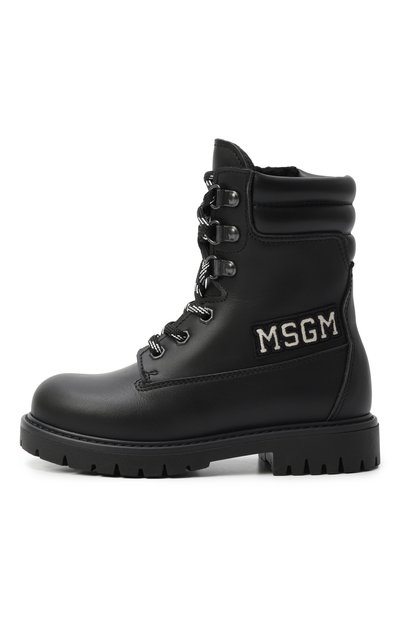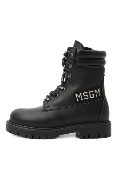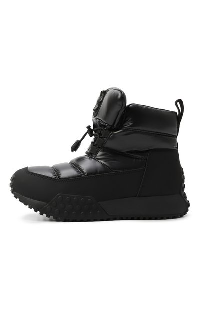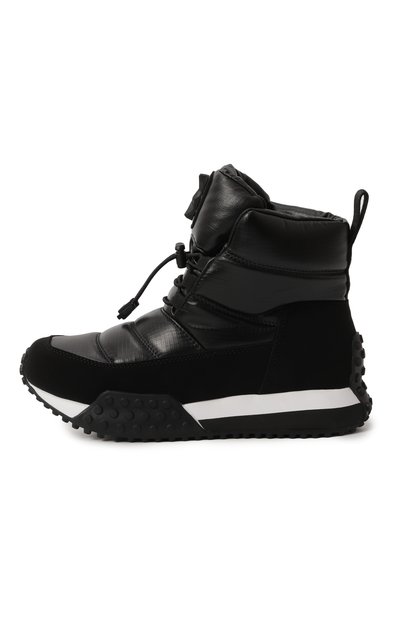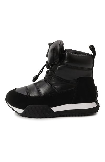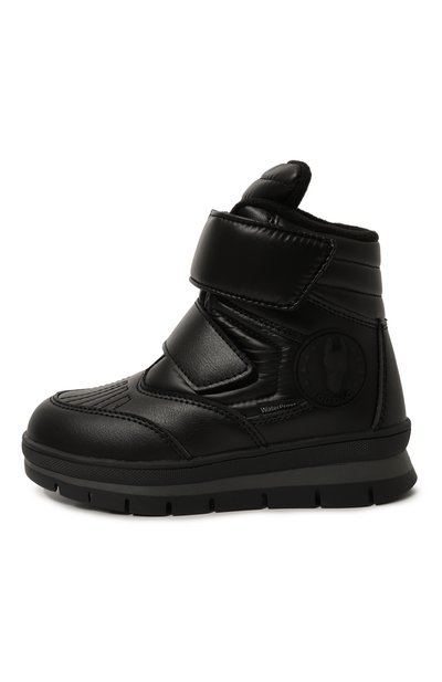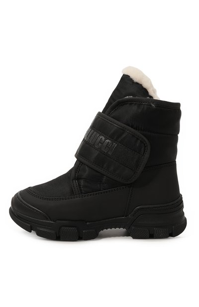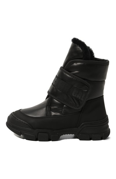 Ботинки с внутренней отделкой из пушистой овчины выполнили из гладкого текстиля и прочного матового материала. Голенище модели на протекторной подошве дополнили широким брендированным ремешком велкро.