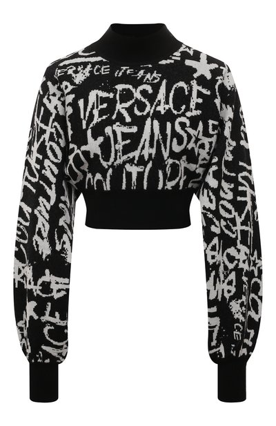 Для изготовления черного укороченного пуловера Донателла Версаче выбрала мягкую тонкую пряжу из шелковистой вискозы и прочного нейлона с добавлением металлизированных волокон, создающих деликатное мерцание. Модель украсили контрастным жаккардовым паттерном в виде логотипа бренда, как будто выполненным с помощью баллончика белой краски.