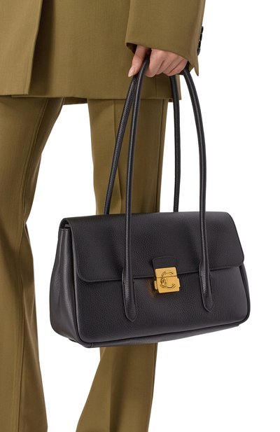 Темно-коричневую сумку Couture 01 с двумя короткими ручками Донателла Версаче украсила символичными пряжками в барочном стиле с выгравированным логотипом марки. Для изготовления модели использовали мягкую прочную кожу с крупнозернистой фактурой. Внутри хватит места для кошелька, смартфона и ключей. В комплекте — съемный плечев ой ремень.