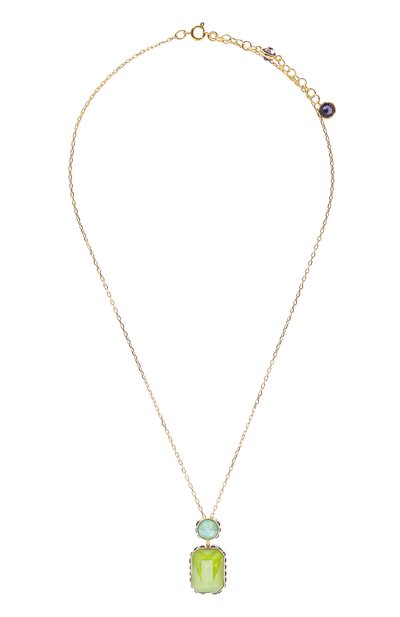 Двойная подвеска на этом колье из ювелирного сплава с покрытием цвета золота умеет менять оттенки. Если повернуть нижнюю часть, то зеленый кристалл огранки «октагон» уступит место голубому. Неизменным останется ряд фиолетовых элементов сбоку, который перекликается с парным декором на конце регулируемой цепочки якорного плетения.