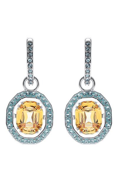 Серьги из коллекции Chroma станут ярким акцентом в образе. В центре подвески из металла с родиевым покрытием будто парит крупный золотисто-желтый кристалл восьмиугольной формы. Его окружает кольцо из голубых и прозрачных стразов меньшего размера и даже основание украшения декорировано хр устальным паве. Обратная сторона аксессуара представляет собой ажурную конструкцию с выгравированным фирменным лебедем.