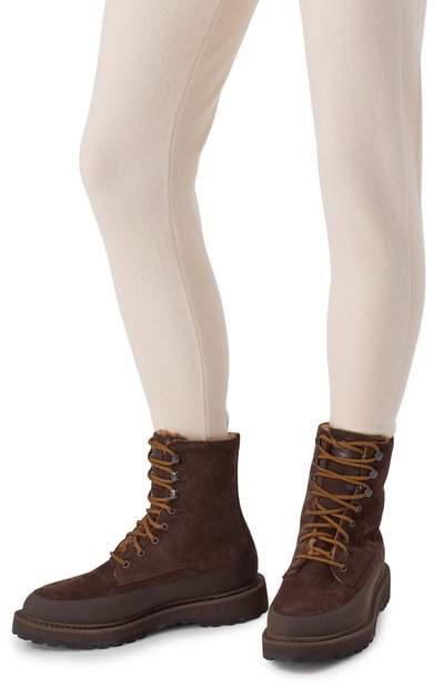 Для пошива коричневых ботинок Vancouver Джанвито Росси выбрал мягкую бархатистую замшу и мелкозернистую кожу в тон. Шнуровку дополнили фиксатором, в фигурном силуэте ко торого угадывается эмблема марки. Верх соединили с массивной протекторной подошвой, поддерживающей маскулинный характер модели.