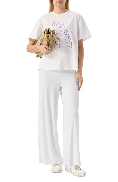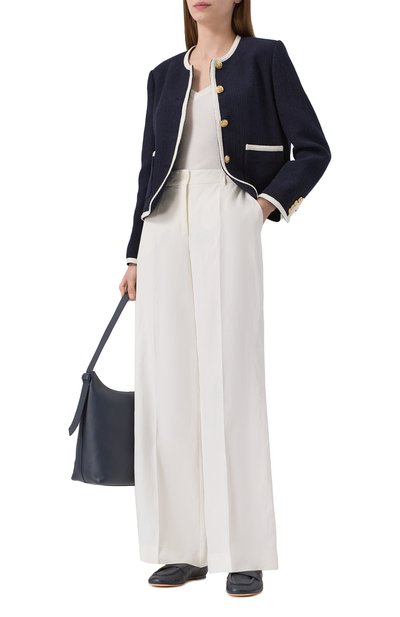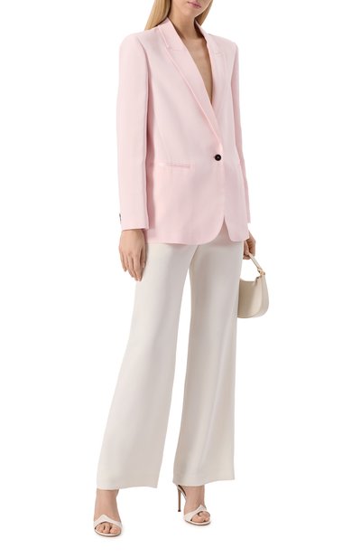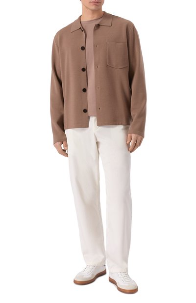 Прямые кремовые брюки – комфортный вариант для прохладной погоды. Для изготовления модели Пьетро Брунелли выбрал мягкий трикотаж из тонкой шерсти и нежного кашемира, в который для прочности добавили шелковистые волокна вискозы и полиэстера. За удобную посадку на талии отвечает широкий эластичный пояс, не сдавливающий тело.