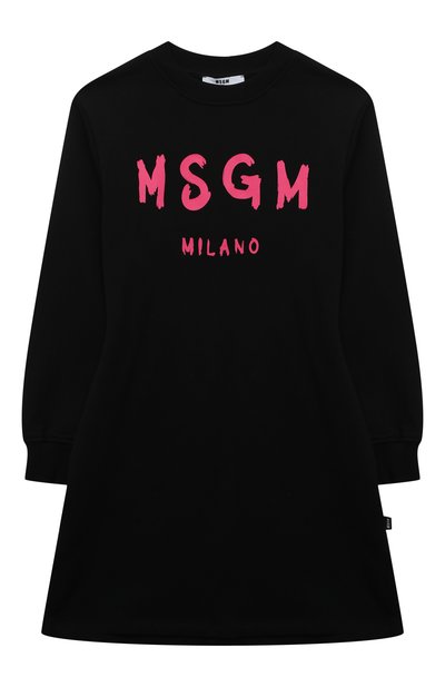 Для пошива черного платья, в которо м отчетливо читается свитшот, мастера марки использовали плотный хлопковый трикотаж. Материал не препятствует циркуляции воздуха и оставляет движения свободными. Приталенный силуэт сформировали эластичной вставкой сзади. Спереди словно неоновой розовой краской изобразили логотип бренда.