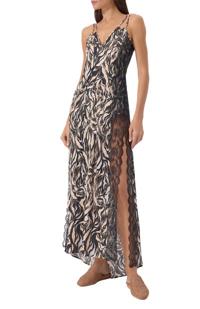 Итальянские мастера сшили длинную бежевую сорочку из тонкого эластичного модала с деликатным блеском. Невесомый трикотаж красиво струится по фигуре, практически не ощущается на коже и идеально пропускает воздух, сохраняя оптимальный микроклимат. Романтичный акцент добавляет контрастная аппликация из нежного кружева Leavers. Короткие рукава-реглан дополнены пуговицами. По бокам предусмотрены высокие разрезы.