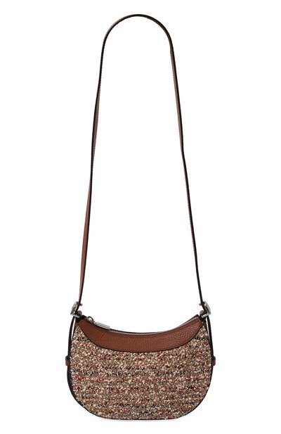 Для пошива полукруглой сумки Whisper мастера марки использовали фактурный разноцветный текстиль, который оттенили деталями из коричневой однотонной кожи. Элементы, которыми фиксируется регулируемый плечевой ремень, выполнили в виде знакового для аксессуаров бренда плектра. Внутрь поместятся телефон, картхолдер и ключи.